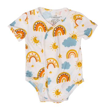 Tutina Neonato Sole Luna Arcobaleno con Chiusura Silenziosa a Velcro, Manica Corta in Bambù e Spandex, Morbida, Unisex, Design Personalizzato con Logo ed Etichetta